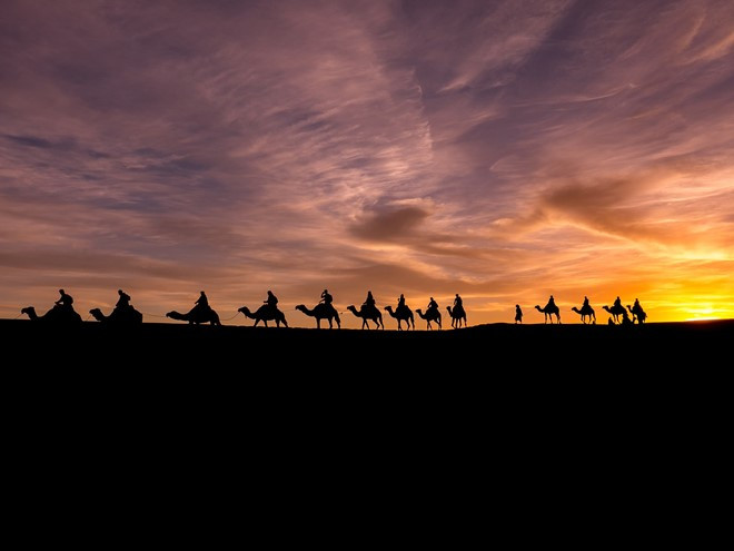 Sa mạc Sahara, Morocco: Du khách nghỉ đêm dưới bầu trời sao tại sa mạc Sahara, rồi thức dậy thật sớm để cưỡi lạc đà ngắm những đụn cát từ từ chuyển màu dưới ánh mặt trời mọc.