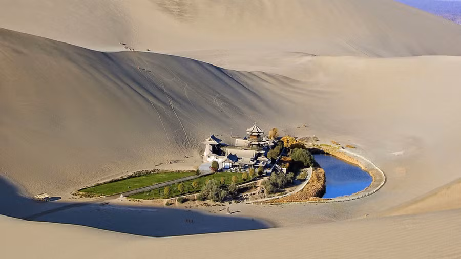 Ốc đảo bán nguyệt Crescent, Trung Quốc: Hồ bán nguyệt Crescent, ở thành phố Đôn Hoàng là điểm dừng chân chính của các thương nhân buôn bán trên con đường tơ lụa, khi đi qua sa mạc Gobi. Ốc đảo được đặt tên theo hình dạng hồ nước ở đây. Bên cạnh hồ là một ngôi chùa cổ mang kiến trúc truyền thống Trung Hoa. Đây là điểm thu hút một lượng lớn du khách đến thăm mỗi năm.