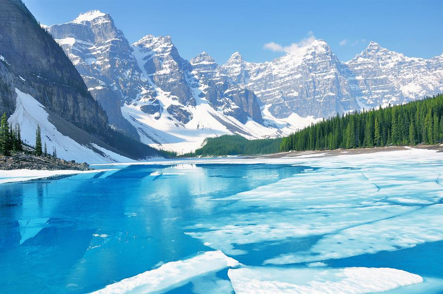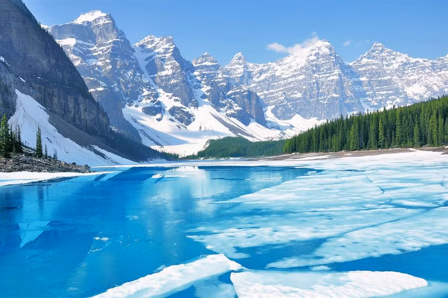 Tùy thuộc vào ánh sáng và thời gian trong ngày, mặt nước của hồ Moraine tại vườn quốc gia Banff có thể thay đổi màu sắc khác nhau. Hồ được bao quanh bởi những ngọn núi phủ tuyết và rừng thông xanh mướt.