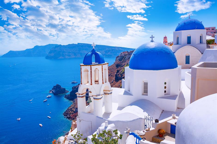 Nét hấp dẫn nhất của hòn đảo Santorini là những ngôi nhà tường trắng mái xanh nằm trên vách núi nhìn xuống biển Aegean. Đây cũng là một trong những địa điểm ngắm hoàng hôn lý tưởng nhất thế giới.