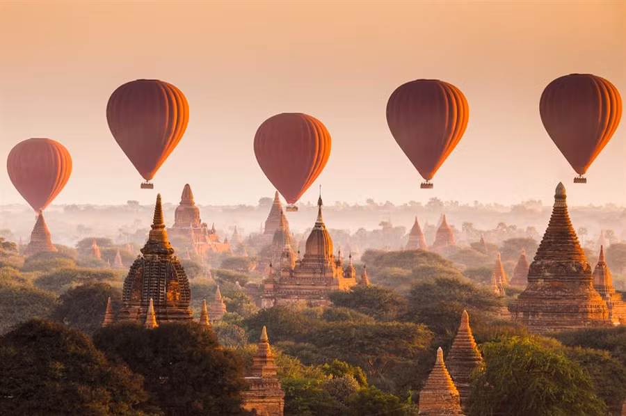 Thành phố cổ Bagan gây ấn tượng với các ngôi đền được xây dựng từ thế kỷ thứ 11 cùng khung cảnh thiên nhiên nguyên sơ. Cách lý tưởng nhất để chiêm ngưỡng phong cảnh nơi đây là bằng khinh khí cầu lúc sáng sớm.