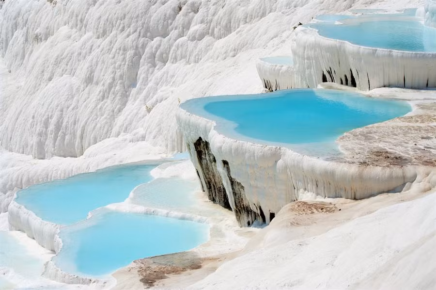 Những hồ nước bậc thang trên sườn núi ở Pamukkale là kết quả của quá trình đá vôi bị xói mòn bởi dòng suối nước nóng qua nhiều thế kỷ.