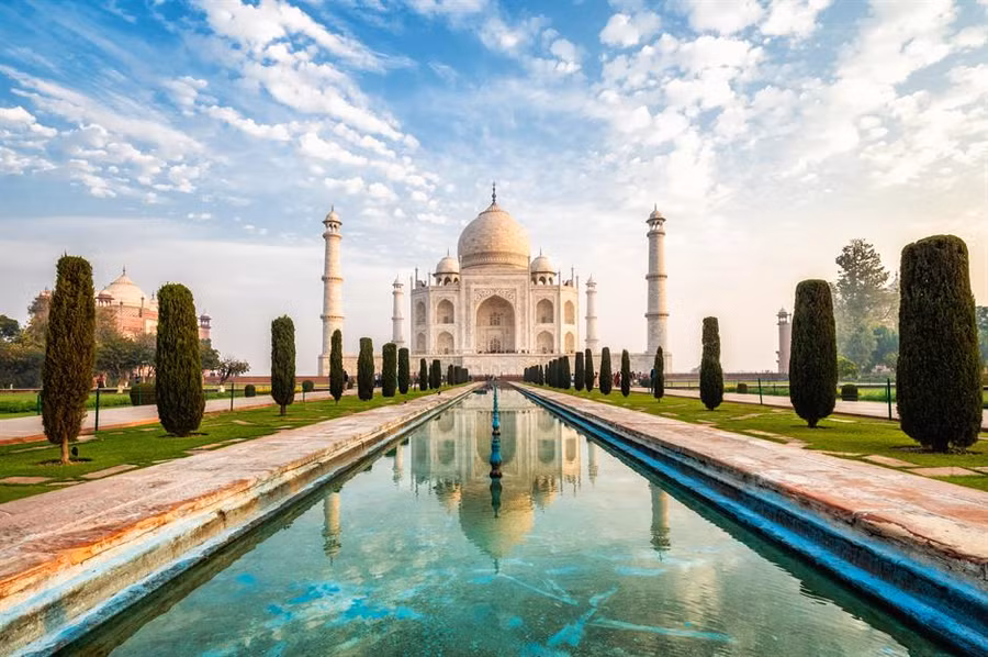Ngôi đền nằm trên bờ phía nam của sông Yamuna ở thành phố Agra. Công trình được xây dựng bằng đá cẩm thạch trắng trong thời gian từ năm 1632 đến 1648, để làm lăng mộ cho vợ của một vị vua ở đây. Ngôi đền được bao quanh bởi các khu vườn đẹp và một hồ nước dài.