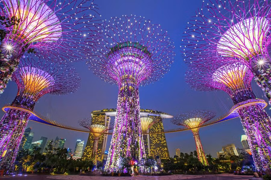 Các siêu cây trong khu vườn Gardens by the Bay có chiều cao từ 25m đến 50m. Chúng được chiếu sáng vào ban đêm, tạo nên không gian lung linh, huyền ảo.