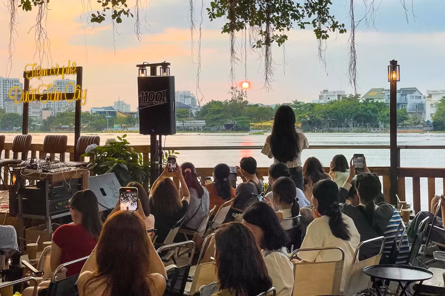 Đậu Văn Anh, chủ quán Tony Riverside Coffee, cho biết trời nắng thì khách tới quán càng đông, đặc biệt vào cuối tuần. Hiện nay, đêm nhạc tại quán sẽ miễn phí cho tất cả các khách hàng. Đêm nhạc sẽ vào thứ sáu và thứ bảy từ 19 giờ 30. Nước uống tại quán sẽ dao động từ 27.000 – 45.000 đồng.