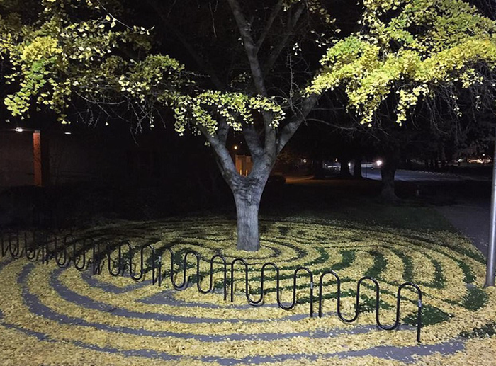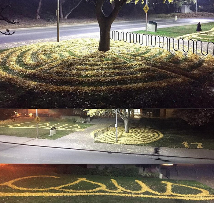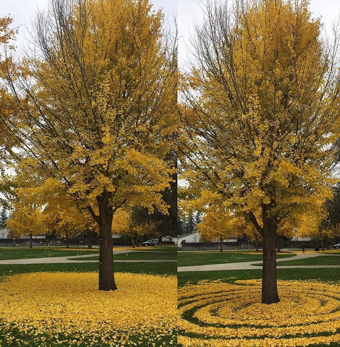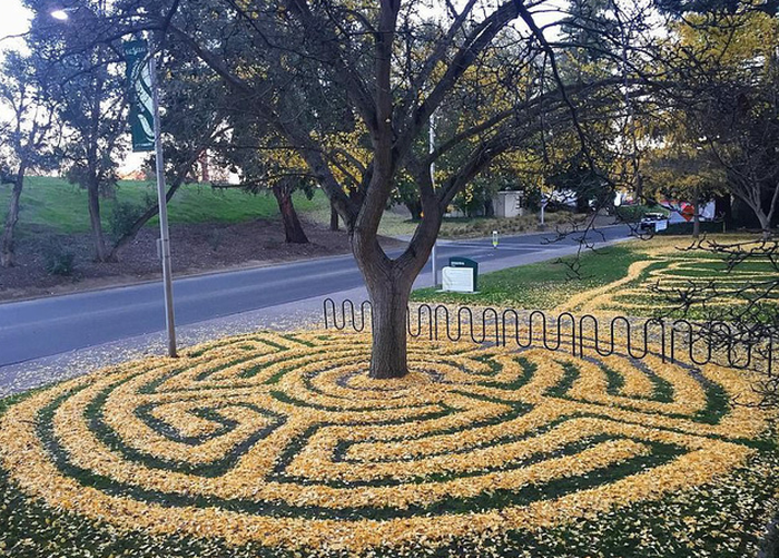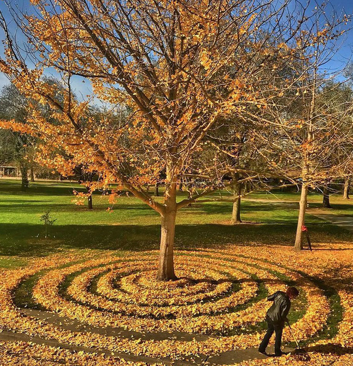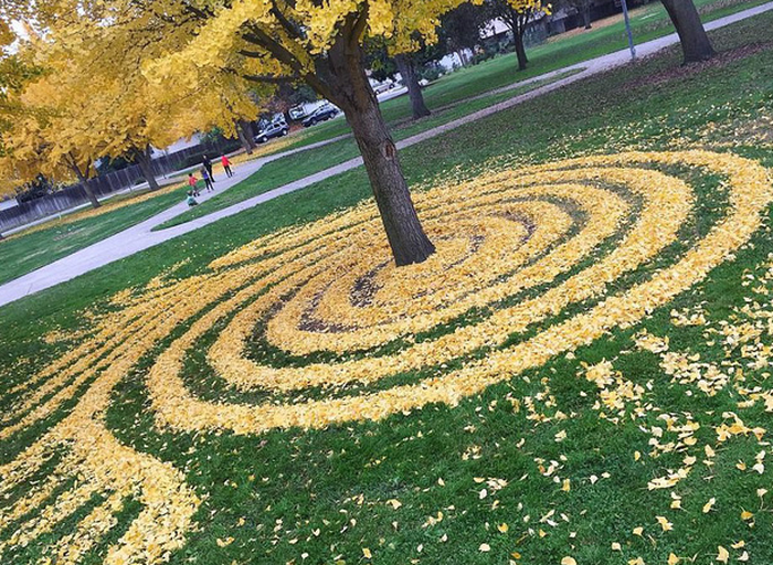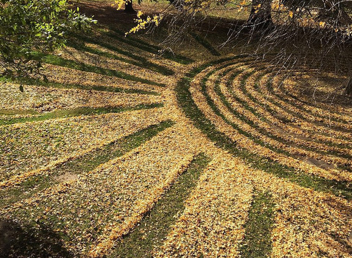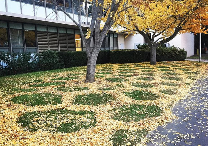 Dưới óc sáng tạo nghệ thuật, một giảng viên đại học đã tạo nên những tác phẩm đẹp mắt từ thảm lá vàng rụng trong sân trường đại học ở Mỹ.