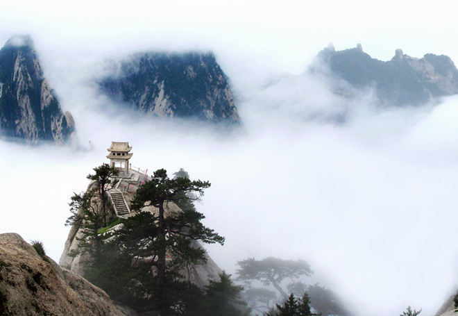Hoa Sơn: Những ai từng đọc truyện Kim Dung không thể không biết tới núi Hoa Sơn, nơi có môn phái cùng tên nổi danh thiên hạ với Hoa Sơn kiếm pháp và Tử hà thần công. Đây là một ngọn núi thuộc dãy Tần Lĩnh của tỉnh Thiểm Tây. Đây còn là nơi diễn ra Hoa Sơn luận kiếm, một sự kiện đặc biệt của giới võ lâm trong truyện của Kim Dung. Trong lịch sử, Hoa Sơn là nơi ẩn cư của các nhà hiền triết, từ các tu sĩ đạo Lão tới nhà sư Phật giáo. Đường lên núi hiểm trở khó lường, chỉ dành cho những người có ý chí mạnh mẽ và sức khỏe hơn người.
