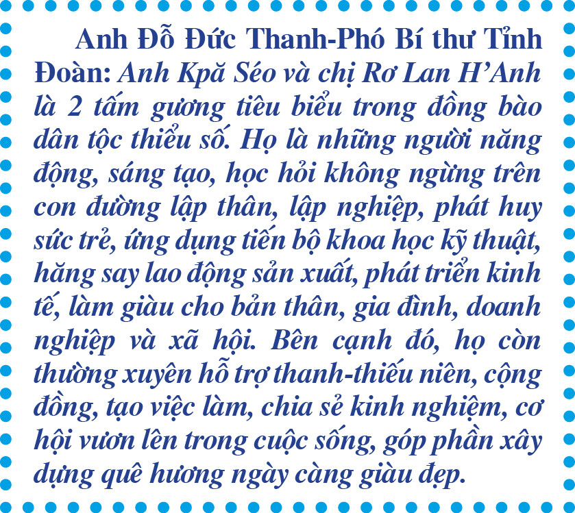 Ông Trịnh Thanh Khiết-Bí thư Đảng ủy xã Đất Bằng-nhận xét: Anh Kpă Séo là tấm gương điển hình về nỗ lực vượt khó vươn lên trong cuộc sống. Đặc biệt, HTX Nông nghiệp và dịch vụ thanh niên xã Đất Bằng đã giúp các thành viên nâng cao hiệu quả sản xuất, có đầu ra ổn định, đồng thời hỗ trợ người dân phương pháp kỹ thuật chăm sóc cây trồng, vật nuôi, giải quyết việc làm.