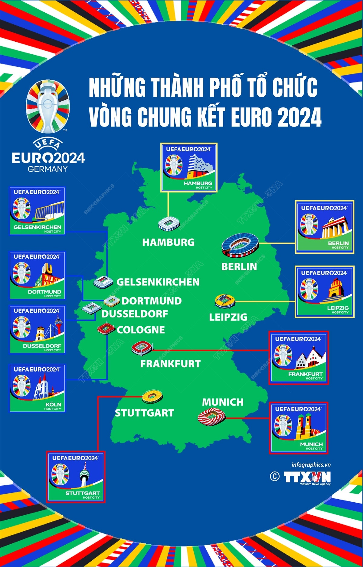 Các trận đấu tại vòng bảng diễn ra từ ngày 15/6 đến 27/6. Vòng đấu loại trực tiếp sẽ bắt đầu từ ngày 29/6 đến 15/7. Có 10 sân vận động thuộc 10 thành phố của nước Đức tổ chức các trận đấu tại vòng chung kết Euro 2024.