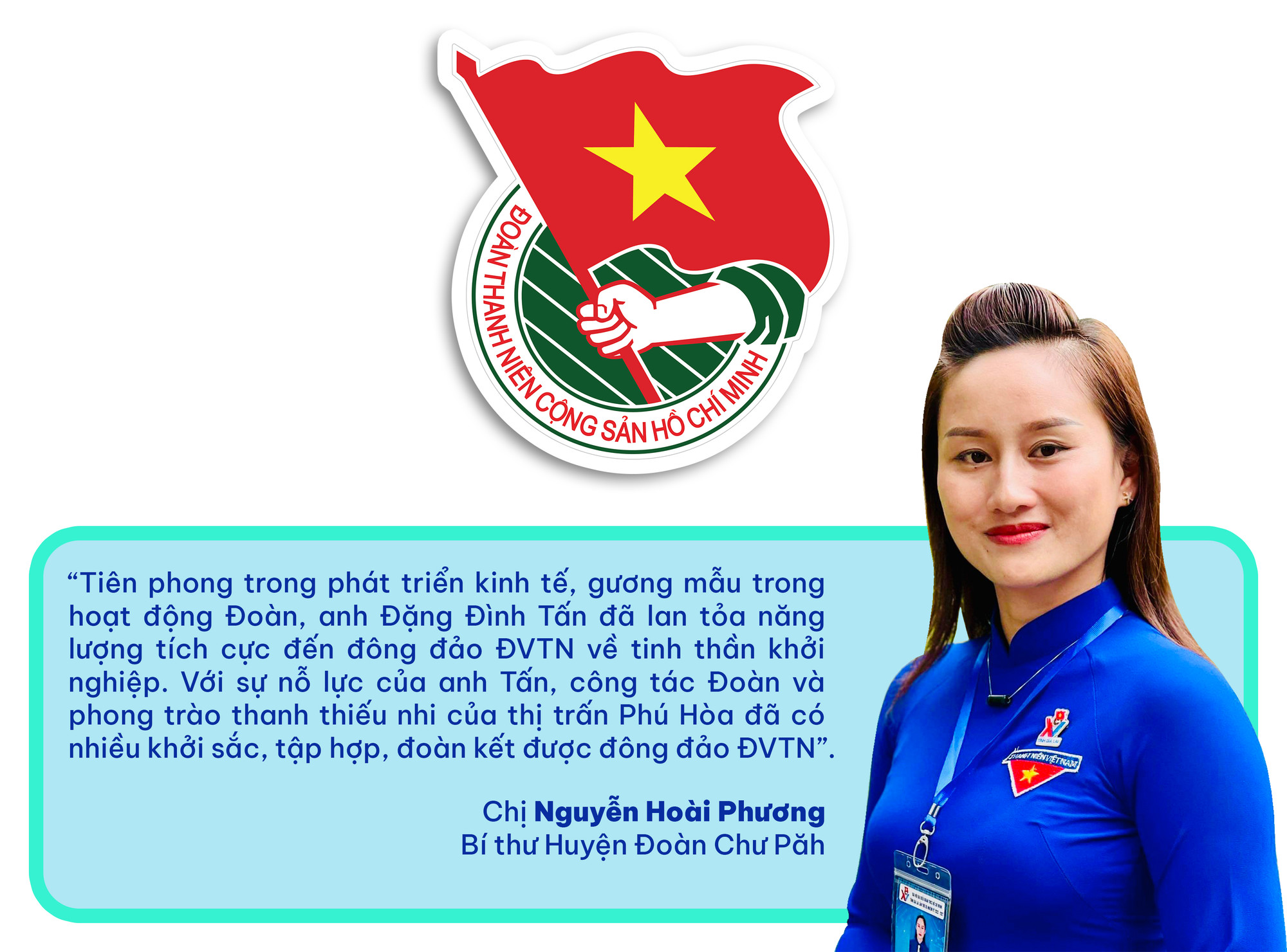 Với những đóng góp tích cực trong công tác Đoàn, anh Tấn được Huyện Đoàn Chư Păh tặng nhiều giấy khen vì có thành tích xuất sắc trong công tác Đoàn và phong trào thanh thiếu nhi. Anh Tấn chia sẻ: “Thủ lĩnh” thanh niên phải đi đầu, không ngại khó, ngại khổ trong mọi hoạt động thì ĐVTN mới nghe và làm theo. Các hoạt động Đoàn đã giúp tôi có thêm nhiều kinh nghiệm, kỹ năng bổ ích.