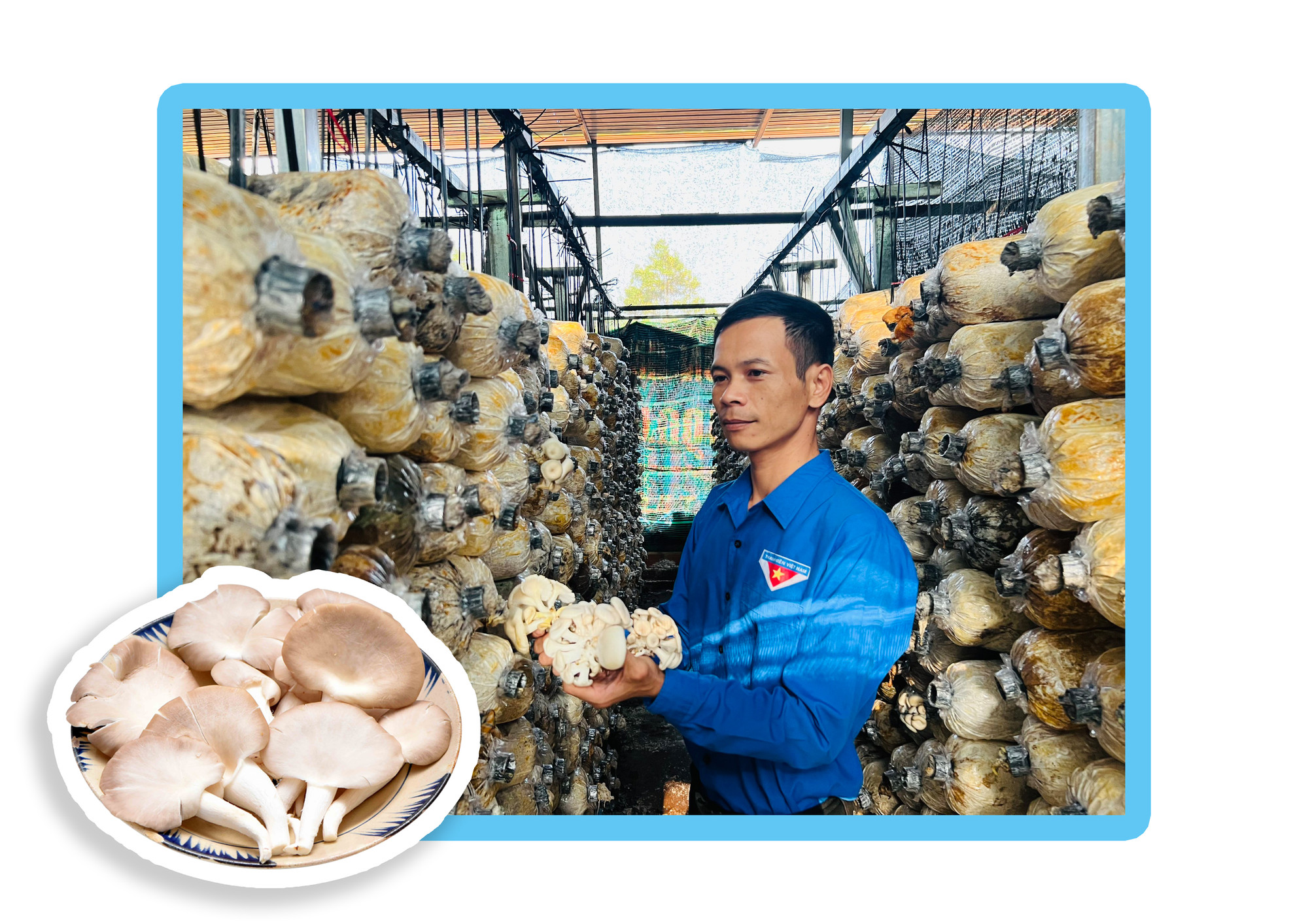 Anh Đặng Đình Tấn (SN 1990, tổ 3, thị trấn Phú Hòa, huyện Chư Păh) khởi nghiệp với nghề trồng nấm từ năm 2017. Hành trang khởi nghiệp của anh là sức trẻ và tinh thần dám nghĩ, dám làm. Anh cho biết: “Ban đầu, tôi trồng thử nghiệm nấm bào ngư, nấm sò và nấm linh chi trên diện tích 50 m2. Sau một thời gian, tôi nhận thấy nấm bào ngư và nấm sò dễ trồng, được thị trường ưa chuộng nên mở rộng diện tích. Tôi trồng nấm theo kiểu gối vụ để đảm bảo lúc nào cũng có nấm xuất ra thị trường”.