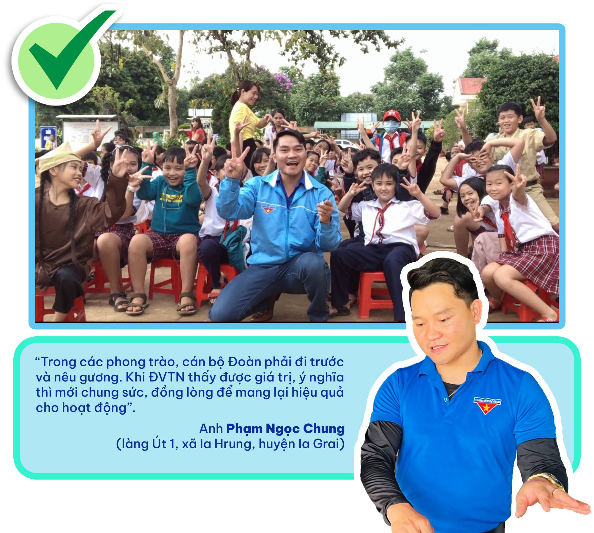 Làm công tác Đoàn cũng giống như “làm dâu trăm họ” với bao công việc không tên, diễn ra cả ngày thứ bảy hoặc chủ nhật nhưng anh Chung vẫn rất tâm huyết, nhiệt tình với các hoạt động. Anh Chung có hơn 30 lần hiến máu tình nguyện; là thành viên tích cực của đội vá đường do anh Lê Tuấn Thành-Cán bộ Công an xã Hà Ra (huyện Mang Yang) khởi xướng.