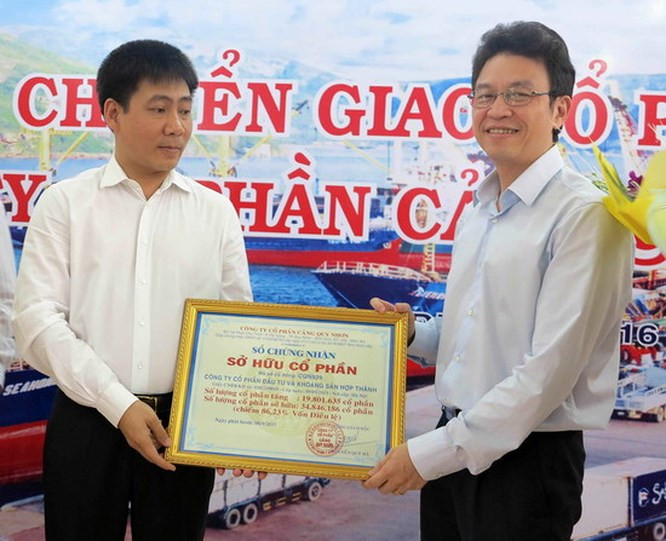 Ông Lê Anh Sơn- Chủ tịch HĐTV Vinalines (trái) trao Chứng nhận sở hữu CP Cảng Quy Nhơn cho ông Lê Hồng Thái, đại diện Cty CP Hợp Thành.