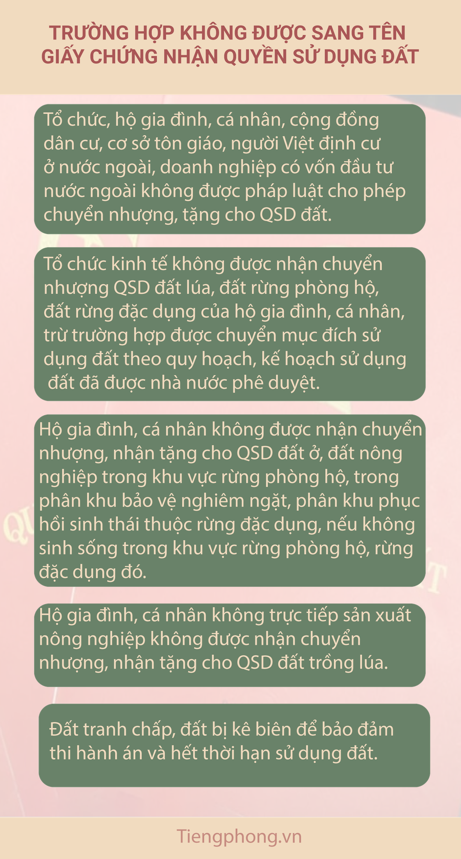 Theo quy định của pháp luật (căn cứ Khoản 1 Điều 168, Điều 191 Luật Đất đai 2013 ) một số trường hợp sẽ không được nhận chuyển nhượng, nhận tặng cho quyền sử dụng (QSD) đất, hay còn gọi là 'sổ đỏ'.