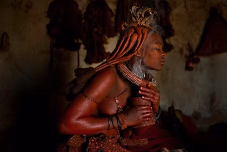 Ở Namibia, cô dâu choàng một “tấm khăn” có tên là Ecora làm từ da dê, người cô được xông bằng nhựa thuốc lá, bôi bóng bằng mỡ động vật và làm cho đỏ au bằng cách xoa đất hoàng thổ lên khắp người.
