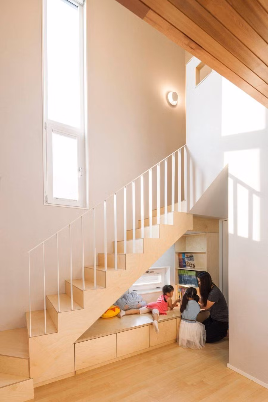 Từ một chiếc ghế dài đọc sách bên ô cửa nhỏ, góc vui chơi mini cho trẻ em, cho đến một quầy cà phê hay góc thiền tĩnh lặng, mọi cách tận dụng đều hướng đến mục tiêu mang lại sự tiện nghi và cảm xúc. Những đường nét gọn gàng, ánh sáng tự nhiên được dẫn vào khéo léo cùng chất liệu gỗ ấm áp, vải mềm, ánh đèn vàng nhẹ giúp không gian trở nên gần gũi và thư thái.