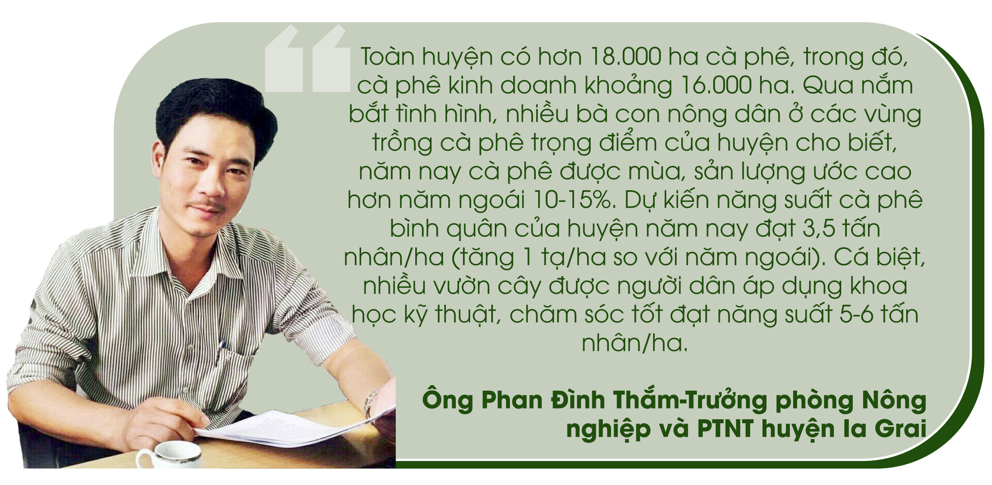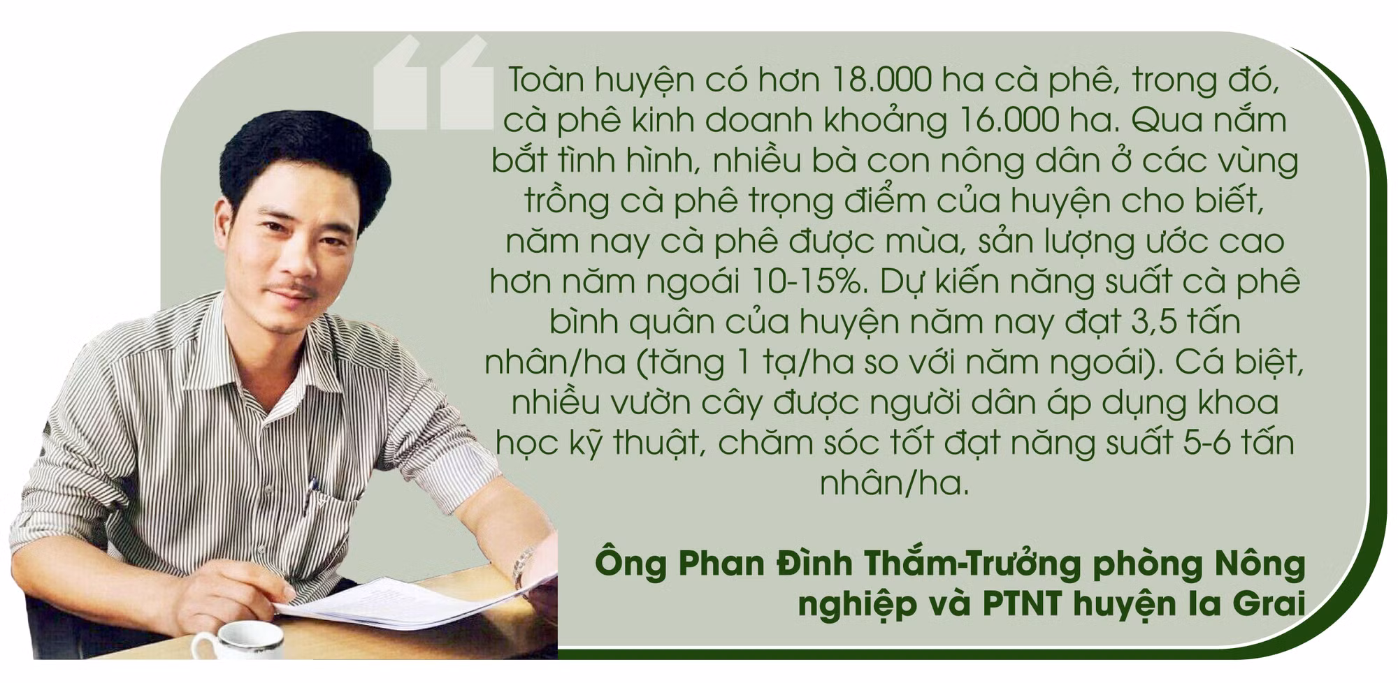 Theo Trưởng phòng Nông nghiệp và PTNT huyện Ia Grai: Thời tiết năm nay thuận lợi cho sản xuất nông nghiệp. Ngoài ra, bà con nông dân có nhiều kinh nghiệm trong việc chăm sóc, phòng trừ bệnh nên vườn cây cho năng suất ổn định. Cùng với đó, người dân đã biết áp dụng khoa học kỹ thuật vào sản xuất như tưới tiết kiệm nước, sử dụng phân vi sinh, phân hữu cơ và hạn chế phân vô cơ. Đồng thời, người dân từng bước trồng cà phê theo tiêu chuẩn 4C có sự liên kết với doanh nghiệp trong sản xuất và tiêu thụ sản phẩm. “Niềm vui của người trồng cà phê như được nhân lên khi niên vụ này, cà phê vừa được mùa, vừa được giá. Với giá cao như hiện nay, người trồng cà phê sau khi trừ chi phí đầu tư sẽ có lợi nhuận 70-100 triệu đồng/ha, giúp họ có điều kiện tái đầu tư cho vụ tới”-ông Thắm cho hay.