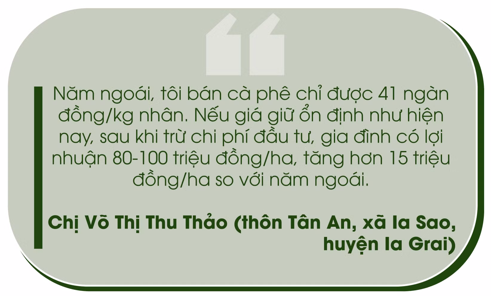 Còn chị Võ Thị Thu Thảo (thôn Tân An, xã Ia Sao, huyện Ia Grai) cho hay: Gia đình chị có gần 3 ha cà phê, năm nay dự kiến thu hoạch được hơn 10 tấn nhân, năng suất cao hơn năm trước khoảng 10%. Hiện tại, giá cà phê dao động ở mức 45-46 ngàn đồng/kg. Còn tháng 9, giá cà phê ở mức 48-49 ngàn đồng/kg mà không có bán. Đây là tín hiệu vui cho người trồng cà phê. Tuy nhiên, năm nay, giá phân bón, thuốc bảo vệ thực vật tăng cao kéo theo chi phí đầu tư cũng tăng lên.