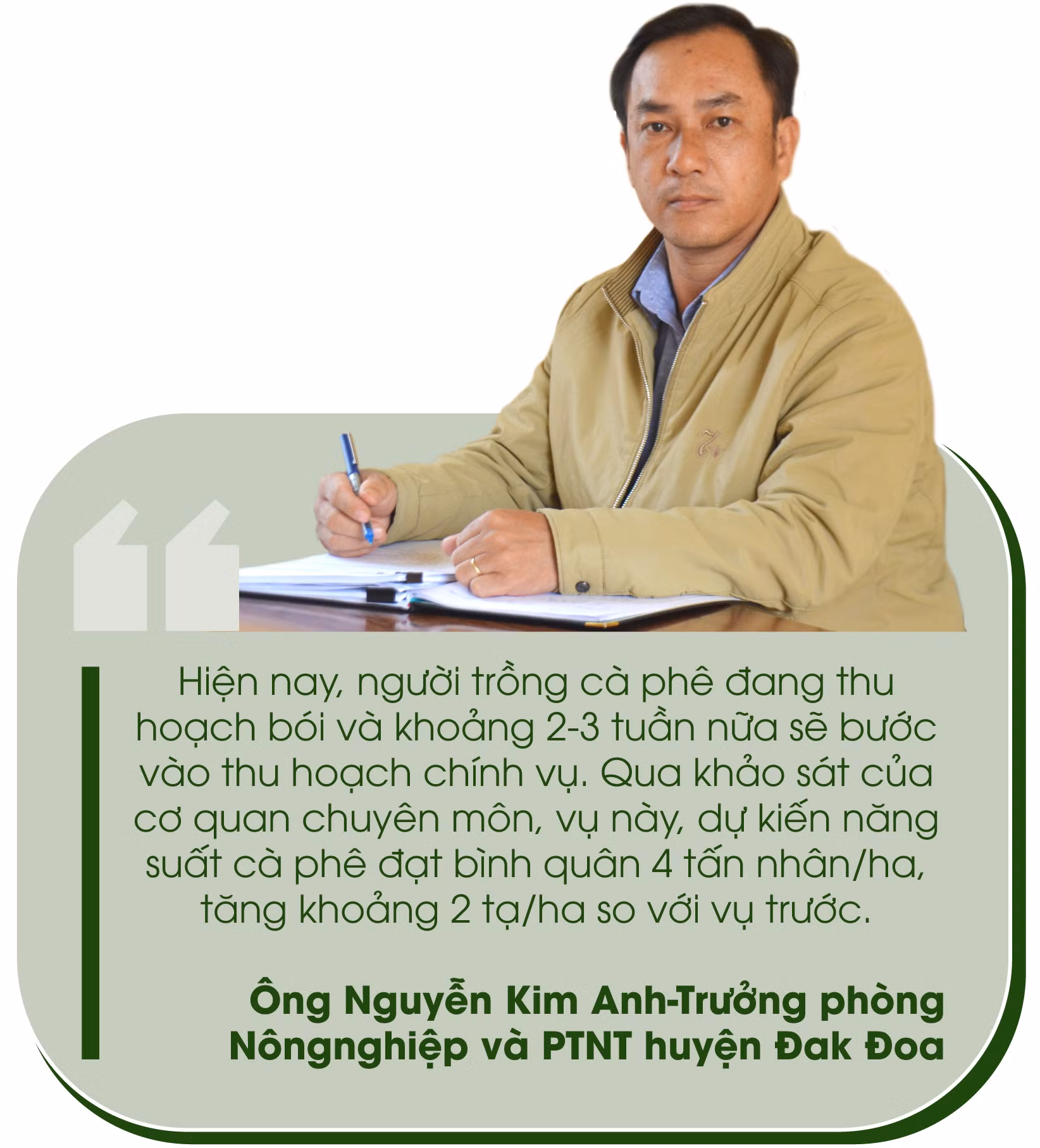 Cũng theo ông Nguyễn Kim Anh, đầu năm nay, giá vật tư nông nghiệp tăng mạnh dẫn đến chi phí đầu vào tăng lên. Tuy nhiên, nhờ thay đổi tư duy sản xuất nông nghiệp theo hướng hữu cơ ít sử dụng phân hóa học nên cây cà phê sinh trưởng, phát triển bền vững.
