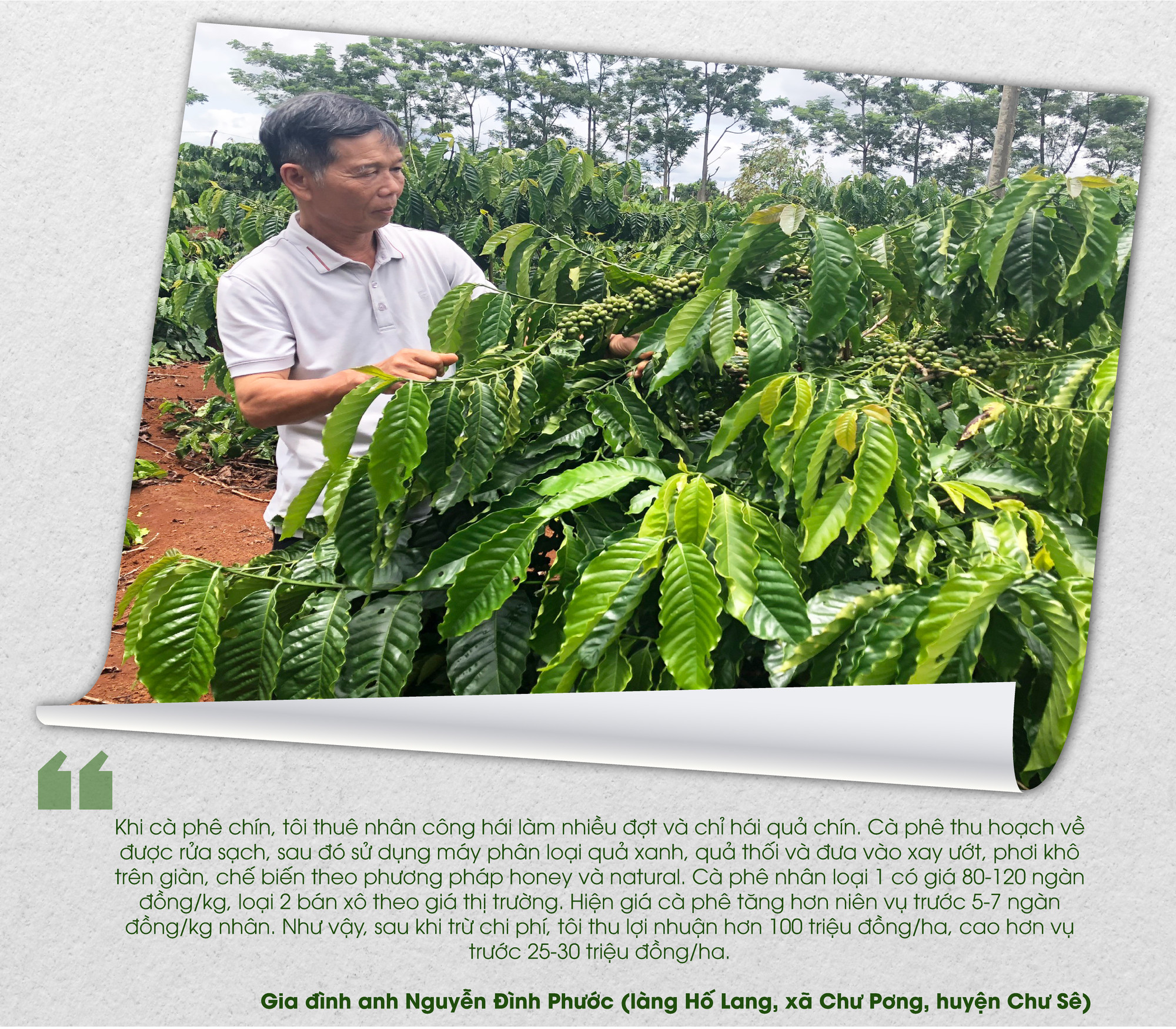 Gia đình anh Nguyễn Đình Phước (làng Hố Lang, xã Chư Pơng, huyện Chư Sê) có 13 ha cà phê. Từ năm 2018, gia đình anh bắt đầu sản xuất theo hướng hữu cơ, chủ yếu sử dụng phân chuồng, phân vi sinh để bón cho vườn cây. Ngoài ra, để giảm chi phí nhân công, anh đã lắp đặt hệ thống tưới phun mưa, tiết kiệm nước trên toàn bộ diện tích. Anh Phước cho biết: Áp dụng sản xuất nông nghiệp theo hướng hữu cơ, gia đình đầu tư khoảng 100 triệu đồng/ha cà phê gồm: phân bón, công chăm sóc, thu hoạch. Năng suất cà phê đạt bình khoảng 4,5-5 tấn nhân/ha.