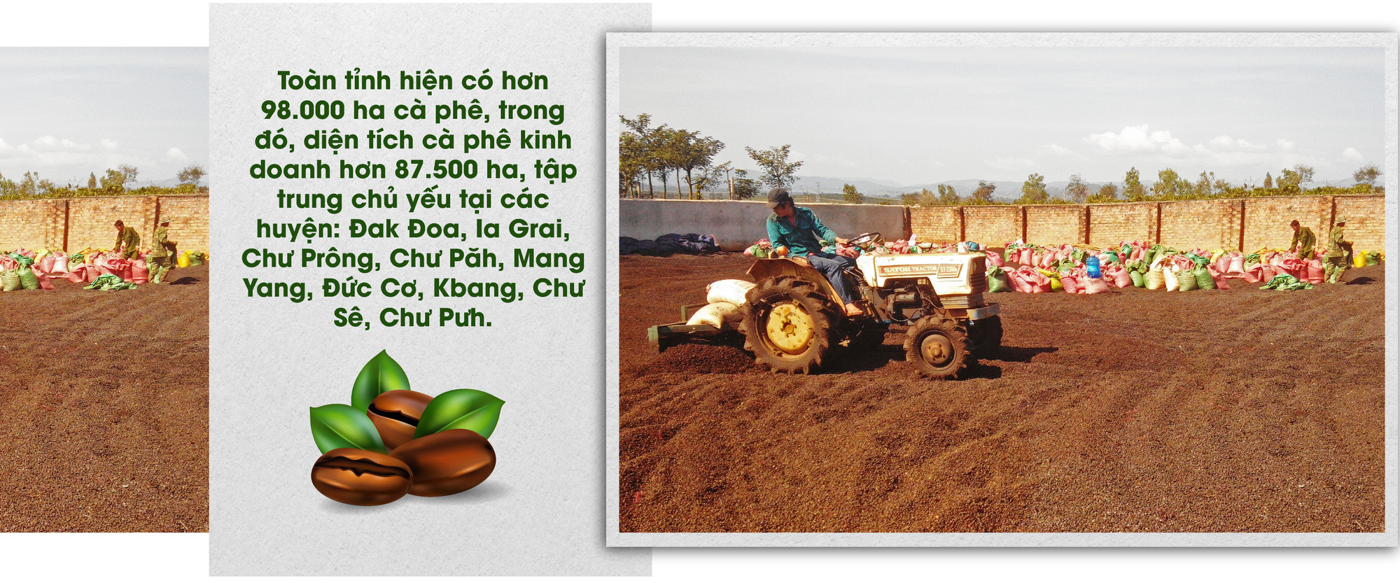 Huyện Đak Đoa có diện tích cà phê lớn nhất tỉnh với hơn 28.000 ha, trong đó, diện tích cà phê kinh doanh khoảng 26.000 ha. Vụ thu hoạch năm nay, nhiều người trồng cà phê phấn khởi vì vừa được mùa, vừa được giá. Gia đình anh Xuin (làng Ktăng, xã Kdang, huyện Đak Đoa) có 3,5 ha cà phê. “Với diện tích này năm ngoái, tôi thu được 10 tấn nhân, còn năm nay dự kiến được khoảng 13 tấn. Mỗi héc ta, gia đình tôi đầu tư khoảng 80 triệu đồng tiền phân, công chăm sóc và thu hoạch. Nếu giá ổn định như hiện nay, sau khi trừ chi phí, gia đình thu về khoảng 300 triệu đồng”-anh Xuin nhẩm tính.