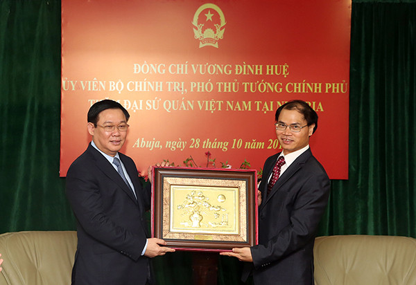 Tối 28/10 (rạng sáng ngày 29/10 giờ Việt Nam) khi tới Thủ đô Abuja (Nigeria), đoàn công tác của Chính phủ do Phó Thủ tướng Vương Đình Huệ dẫn đầu đã tới thăm Đại sứ quán Việt Nam, bắt đầu hoạt động đầu tiên tại Nigeria và chuyến công tác tại châu Phi.