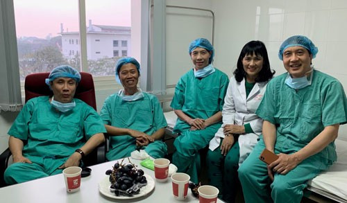 GS Phạm Như Hiệp (bìa trái) cùng ê-kíp phẫu thuật tạm nghỉ ngơi sau ca ghép tim thành công ngày 27-1 Ảnh: XUÂN THỊNH
