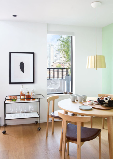 Khu vực ăn uống nằm bên cạnh nhà bếp. Bàn ghế ăn bằng gỗ kết hợp hoàn hảo với màu xanh lá cây của tường nhà.