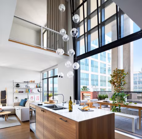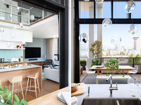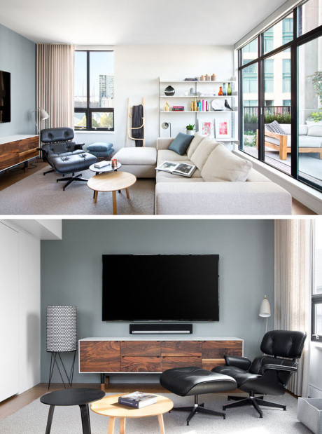 Căn hộ này được lấy cảm hứng từ các yếu tố thiết kế hiện đại kết hợp với gỗ để tạo ra một không gian mở. Trong phòng khách, có giá đỡ kệ được gắn vào tường bên cạnh đi văng. Phòng khách đồng thời là một không gian giải trí của chủ sở hữu.