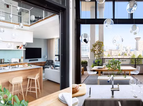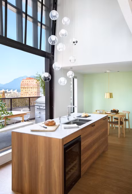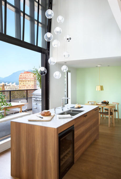 Từ ban công có thể nhìn vào khu bếp thông qua tường kính lớn.