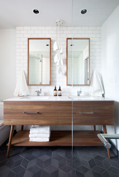 Nội thất phòng tắm chủ yếu được làm từ gỗ công nghiệp, là sự kết hợp hoàn hảo với tông màu trắng của tường nhà.