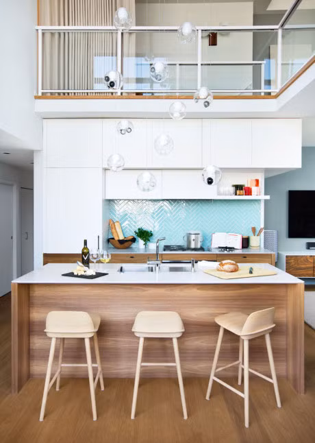 Bên cạnh phòng khách là nhà bếp có tủ trắng phía trên gần như trộn lẫn với bức tường đằng sau. Gỗ đã được sử dụng cho các tủ thấp hơn. Những chiếc ghế gỗ thiết kế đẹp mắt phù hợp với hòn đảo bếp.
