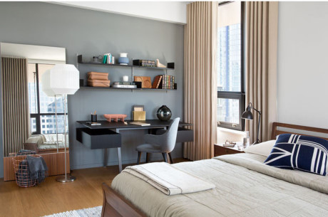 Phòng ngủ này nằm gọn gàng, hiện đại có khu vực làm việc riêng.