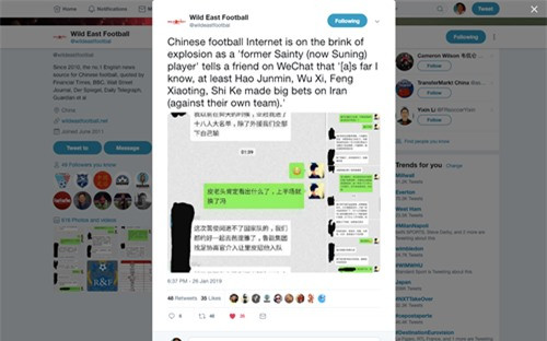 4 cầu thủ bị nêu đích danh là Hao Junmin, Wu Xi, Feng Xiaoting và Shi Ke đã tham gia các cược số tiền rất lớn ở tứ kết Asian Cup 2019. Thậm chí Nguyễn tài khoản Wild East Football trên Twitter (chuyên đưa tin về bóng đá Trung Quốc) đã công bố nội dung tin nhắn của 4 cầu thủ này trên ứng dụng Wechat.