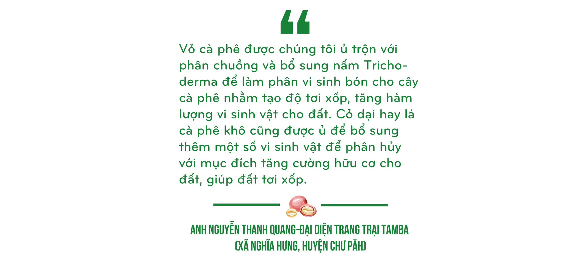 Phát triển kinh tế xanh và bền vững là mục tiêu mà trang trại cà phê Tamba (xã Nghĩa Hưng, huyện Chư Păh) đang hướng tới. Với quy mô gần 200 ha cà phê, những năm gần đây, Tamba đã thay đổi tư duy trong sản xuất, chế biến nhằm nâng cao chất lượng cà phê. Tamba sản xuất theo chu trình khép kín thông qua việc áp dụng tiến bộ khoa học kỹ thuật, công nghệ sinh học mà các chất thải, phế phụ phẩm được tái chế, quay lại làm nguyên liệu đầu vào cho quá trình trồng trọt, chế biến, tạo ra sản phẩm an toàn và giảm ô nhiễm môi trường.