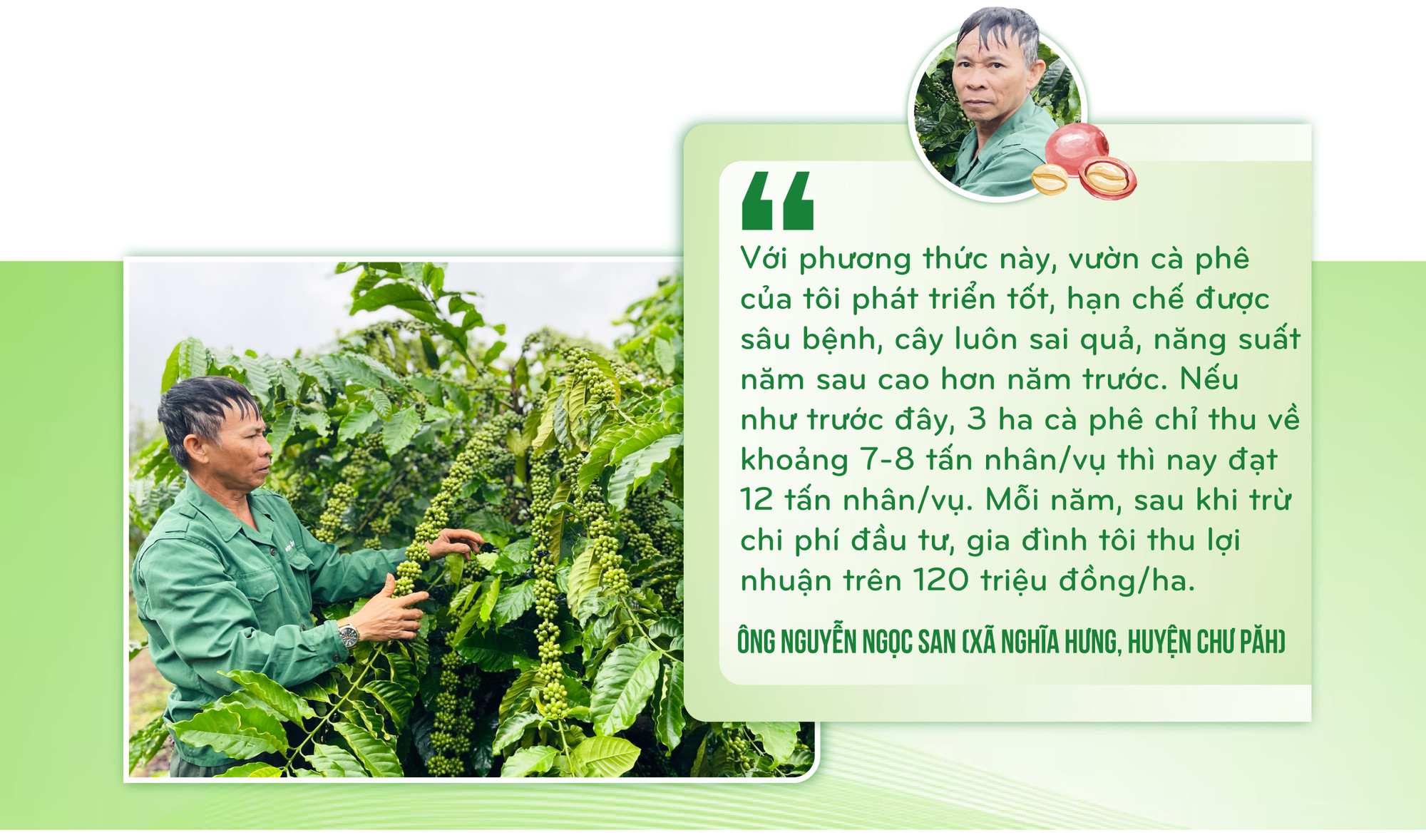Trước đây, gia đình ông Nguyễn Ngọc San (thôn 5, xã Nghĩa Hưng, huyện Chư Păh) trồng cà phê theo phương thức truyền thống. Sau một thời gian, ông nhận ra rằng, việc làm nông nghiệp theo kinh nghiệm và lạm dụng thuốc bảo vệ thực vật khiến vườn cây nhanh già cỗi, cho năng suất thấp. Năm 2017, ông San bắt đầu sử dụng nguồn phân chuồng ủ trấu hoặc vỏ cà phê hoai mục có bổ sung các chế phẩm vi sinh có ích để bón định kỳ cho vườn cây thay vì các loại phân hóa học.