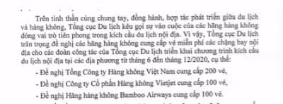 Đáng chú ý, văn bản này còn đề nghị các hãng hàng không cung cấp 400 vé máy bay miễn phí cho đoàn công tác. "Tổng cục Du lịch trân trọng đề nghị các hãng hàng không cung cấp vé miễn phí các chặng bay nội địa cho các đoàn công tác của Tổng cục Du lịch triển khai chương trình kích cầu du lịch nội địa tại các địa phương từ tháng 6 đến tháng 12/2020", văn bản đề nghị.
