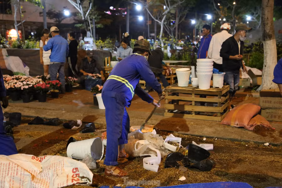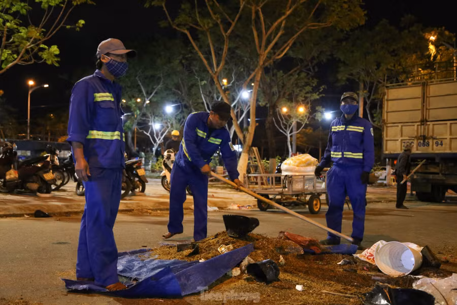 Tối 30 Tết, các công nhân vệ sinh môi trường đã túc trực tại khu vực chợ hoa Tết Đà Nẵng (quận Hải Châu) và bắt đầu dọn dẹp theo kiểu cuốn chiếu.