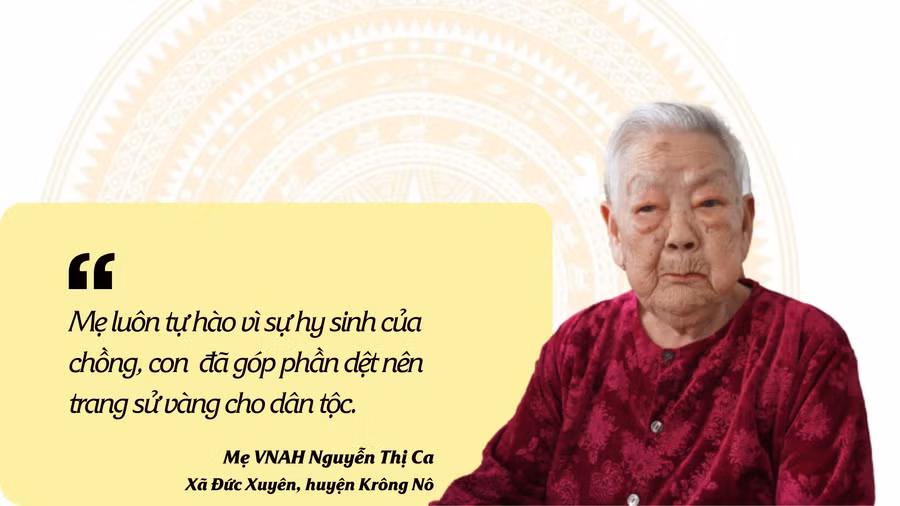 Mẹ VNAH Nguyễn Thị Ca, năm nay 92 tuổi, ở xã Đức Xuyên, huyện Krông Nô có chồng và con trai đều tham gia chiến đấu và hy sinh trong kháng chiến chống Mỹ cứu nước.