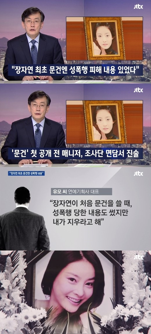 Theo chương trình Newsroom, ông Yoo Jang Ho, cựu quản lý của Jang Ja Yeon, tiết lộ đã buộc nữ diễn viên xóa đi chi tiết bị cưỡng bức nghiêm trọng trong tập tài liệu mà cô viết trước khi qua đời.