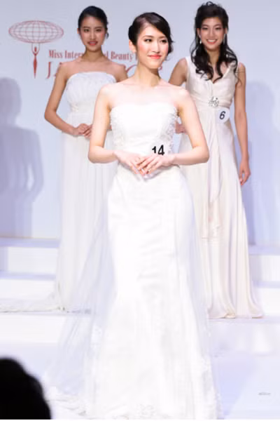 Hinano Sugimoto trải qua các vòng thi áo tắm, kimono, trang phục dạ hội, ứng xử. Cô cao 1,65 m.