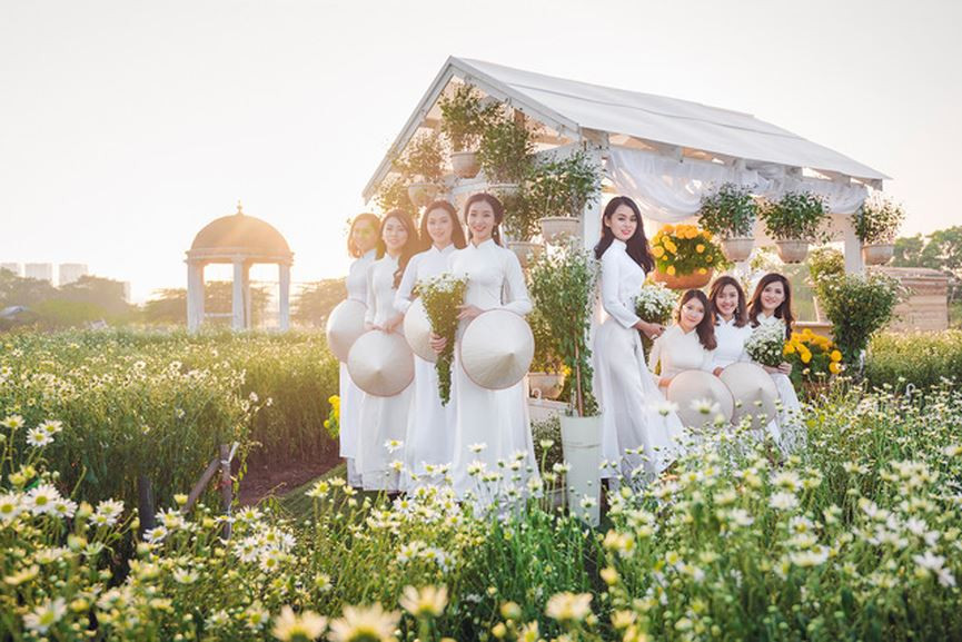 | Thiếu nữ với áo dài cùng cúc hoạ mi trắng. |