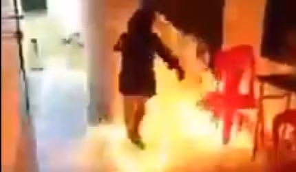 Theo clip ghi lại, sau một hồi thăm dò, nữ sinh này đã quyết định tưới xăng đốt trường. Do đứng quá gần, nữ sinh này cũng bị lửa “liếm” cháy người.