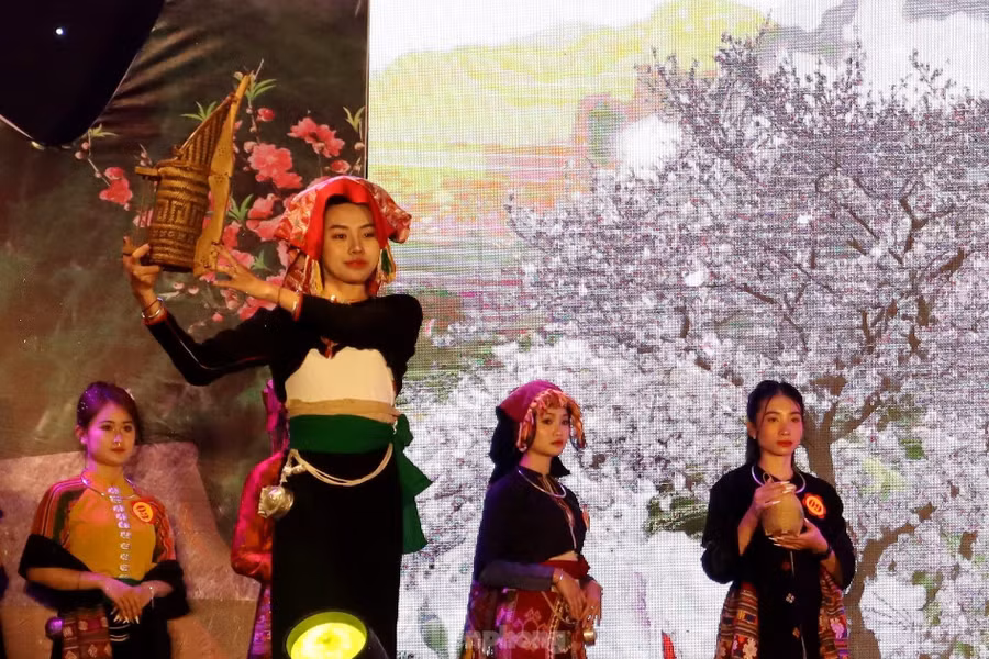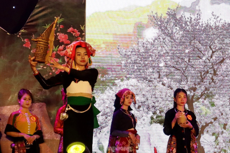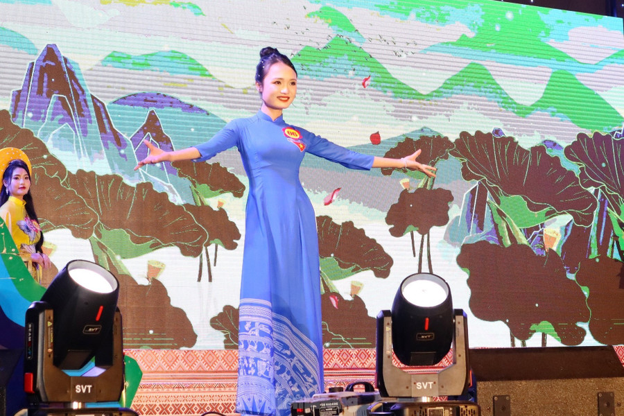| Phần thi trình diễn trang phục dân tộc. Trang phục của cộng đồng người Thái huyện Quỳ Châu được nhiều thí sinh lựa chọn trình diễn. |