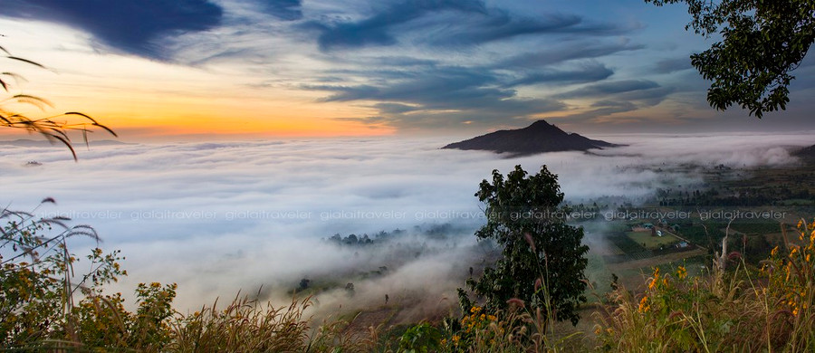 Không chỉ vậy, buổi sáng Gia Lai còn làm say đắm lòng người theo một cách khác. Đứng trên đỉnh núi lửa Chư Đăng Ya, bạn có thể ngắm bình minh tuyệt đẹp với biển mây bồng bềnh trôi. Theo kinh nghiệm của Công, để săn được khoảnh khắc này, bạn phải dậy thật sớm. Leo núi mất khoảng 30 phút và đợi bình minh lên vào thời điểm hơn 5h, bạn bấm máy và bắt trọn cảnh tượng huy hoàng.