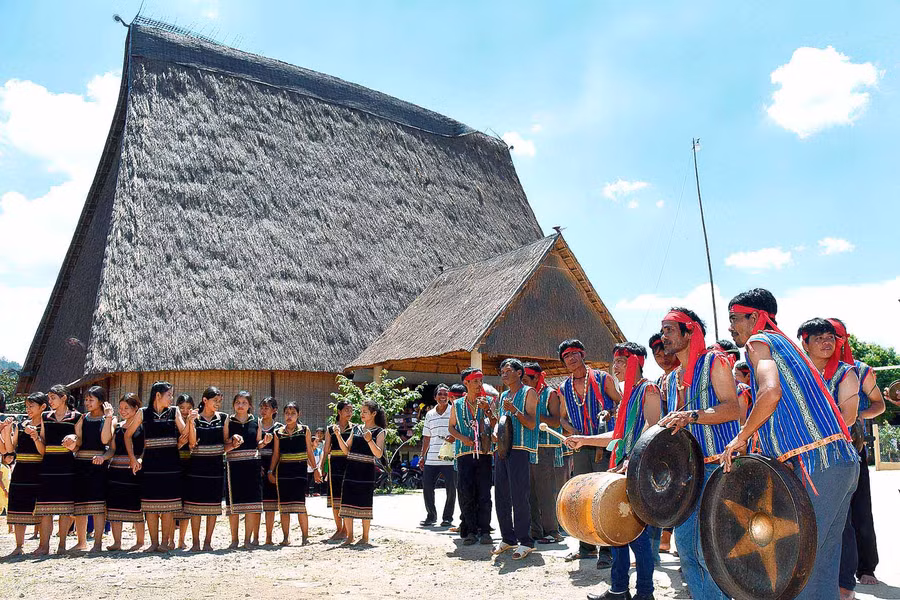 Các nghệ nhân làng Kon Sơ Lăl biểu diễn cồng chiêng mừng công trình nước tự chảy.