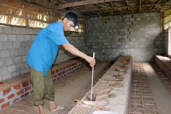 Rời nhà anh Bình, chúng tôi ghé qua một hộ nuôi rắn khác cùng thôn Làng Chưng là gia đình anh Đoàn Văn Ưởng. Khác anh Bình, anh Ưởng chỉ nuôi rắn lấy trứng. Hiện tại, anh Ưởng nuôi 250 con rắn, mỗi năm thu nhập 60 - 100 triệu đồng nhờ bán trứng rắn. Khu chuồng nuôi rắn của anh Ưởng cũng được xây biệt lập, che chắn cẩn thận. Anh còn “chế” dụng cụ đặc biệt để đưa thức ăn vào chuồng rắn, đảm bảo an toàn khi cho rắn ăn.