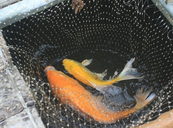 Ông Đinh Quang Tiến đang vớt cá Koi lên khỏi mặt nước. Ảnh: NGUYỄN TRANG.