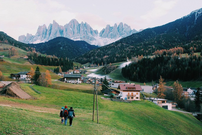 Các ngôi nhà và nhà thờ cổ kính của Val di Funes nằm yên bình trên đồng cỏ xanh mướt, bên dưới khối núi Odle hùng vĩ luôn được yêu thích trên Instagram.