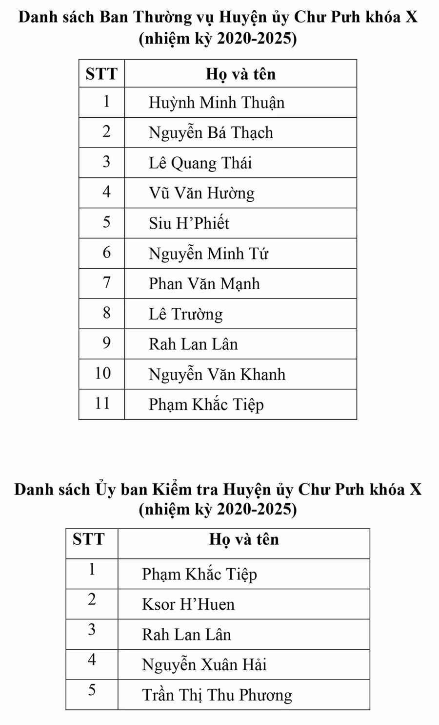Theo đó, Ban Chấp hành Đảng bộ huyện Chư Pưh khóa X đã bầu 11 đồng chí vào Ban Thường vụ Huyện ủy. Ông Huỳnh Minh Thuận-Tỉnh ủy viên, Bí thư Huyện ủy Chư Pưh khóa IX tiếp tục được tín nhiệm bầu giữ chức Bí thư Huyện ủy Chư Pưh khóa X (nhiệm kỳ 2020-2025); ông Nguyễn Bá Thạch-Phó Bí thư Thường trực Huyện ủy Chư Pưh khóa IX và ông Lê Quang Thái-Phó Bí thư Huyện ủy khóa IX, Chủ tịch UBND huyện Chư Pưh được bầu giữ chức Phó Bí thư Huyện ủy Chư Pưh khóa X.